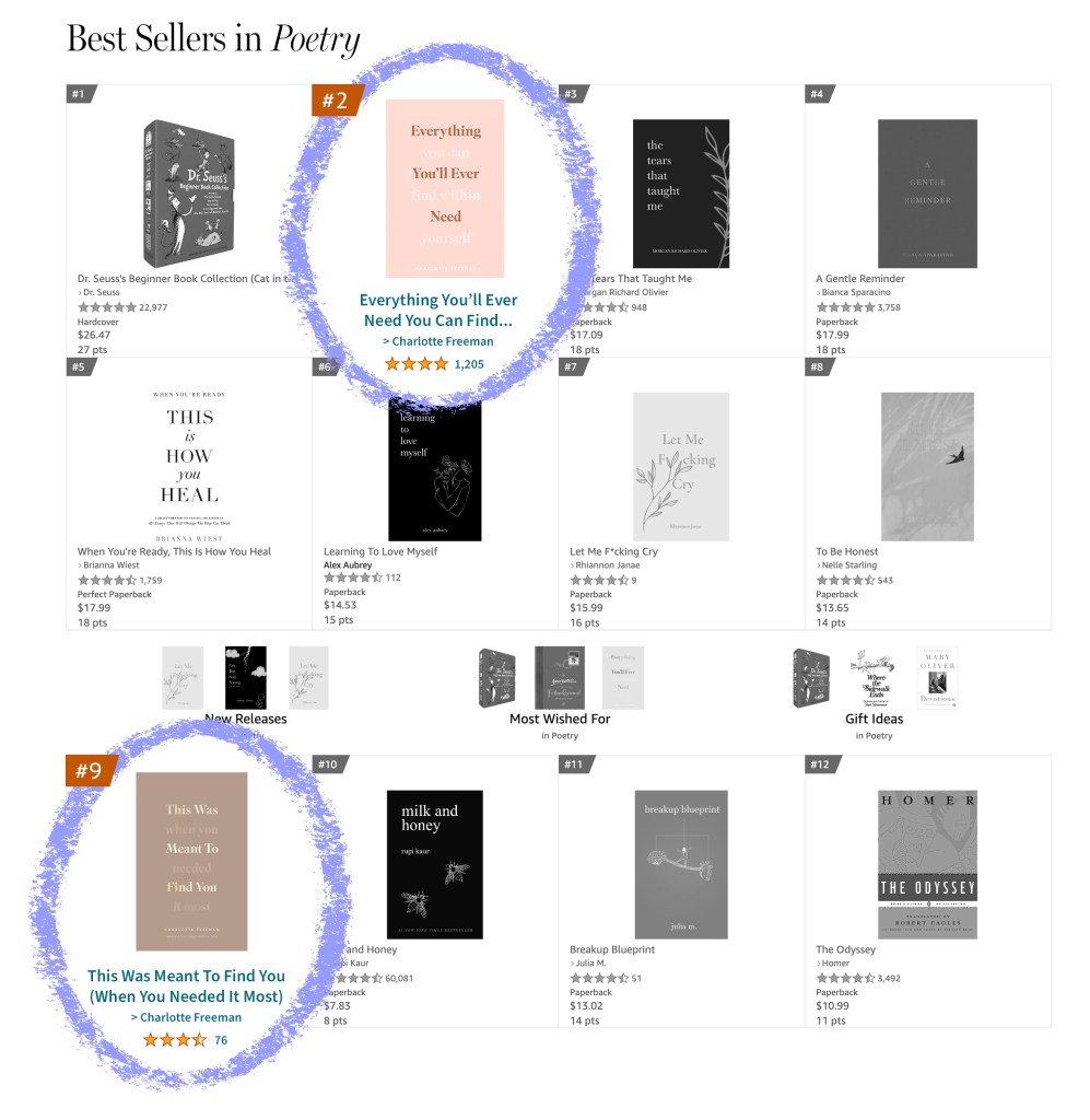 Both of Charlotte’s books stayed on Amazon’s Poetry bestseller list for weeks and saw increased wholesale orders to brick and mortar bookstore partners.